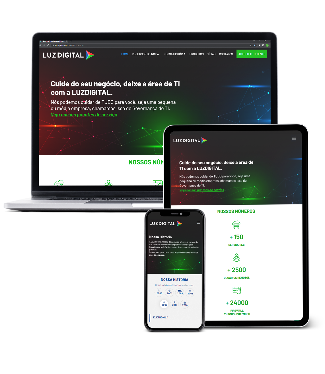 The website presents the service packages and the steps to implement these packages. The first part of the site focused on business owners who don't know much about the subject but want to have security on their network. The second part shows all the features of the products used in the services, so technicians working in larger companies can recommend LUZDIGITAL services.